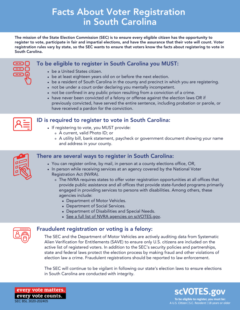 This poster provides important information about voter registration in South Carolina. It outlines eligibility requirements and details the various ways you can register to vote.