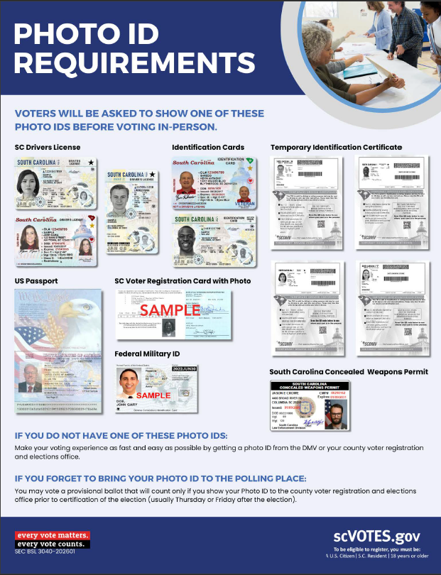 This poster outlines South Carolina's photo ID requirements for voting and what to do if you don't have an ID, including getting a free ID or voting a provisional ballot with a reasonable impediment.