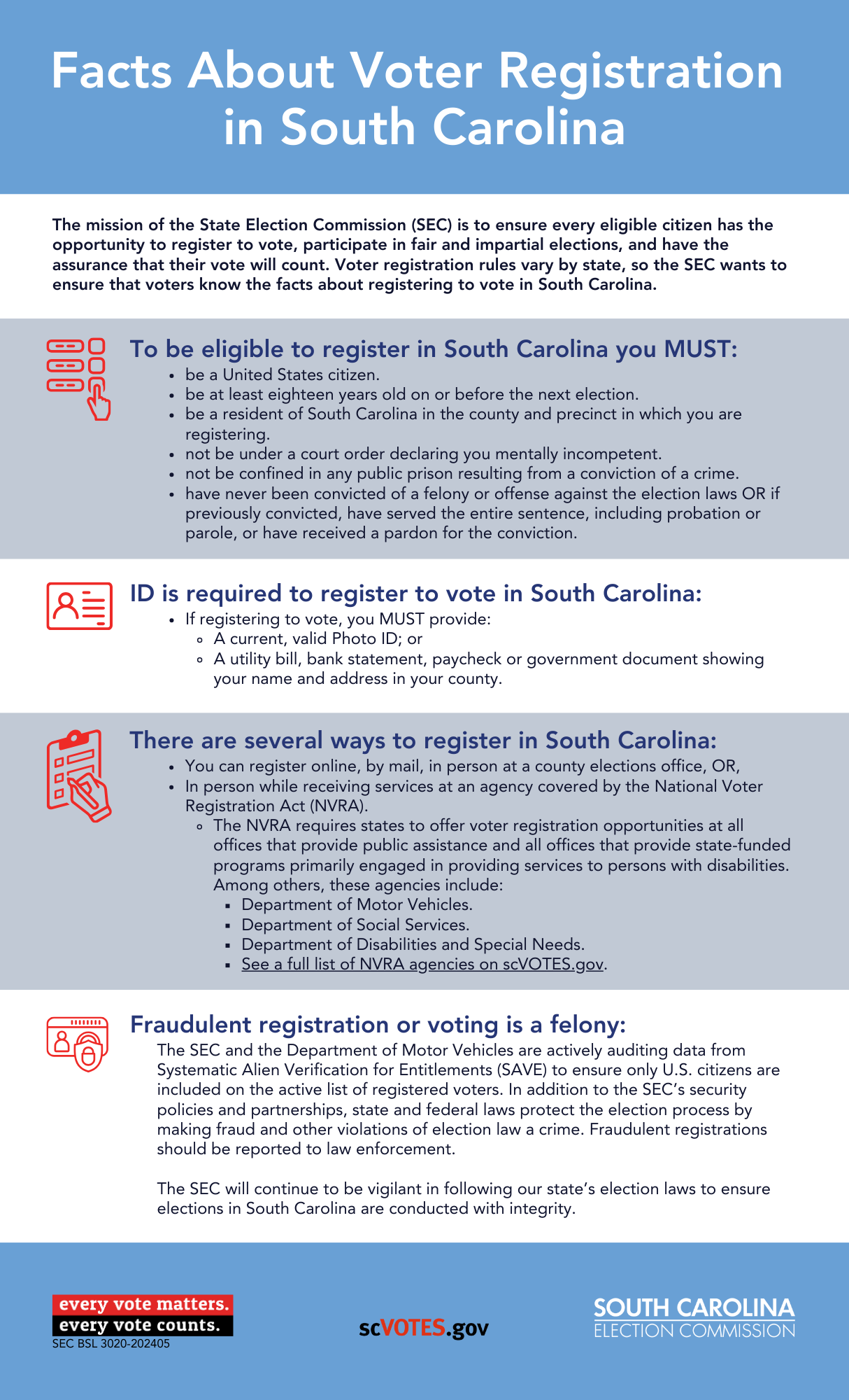 This poster provides important information about voter registration in South Carolina. It outlines eligibility requirements and details the various ways you can register to vote.