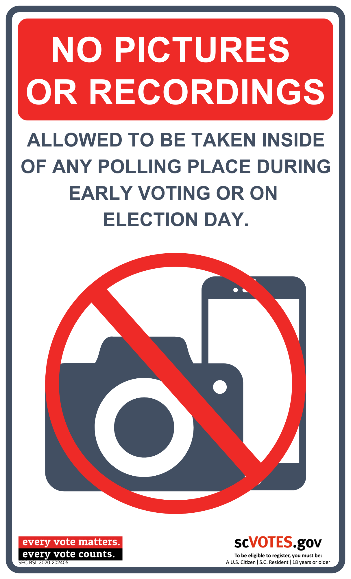 This poster clearly outlines that taking pictures or recordings inside polling places is strictly prohibited during both early voting and on Election Day.