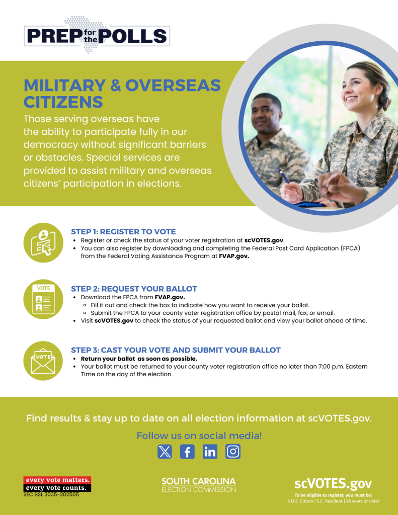 This poster provides instructions for military and overseas citizens on how to register, request a ballot, and vote in South Carolina elections, along with resources for assistance and important deadlines.