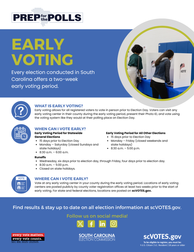 This poster provides key information about early voting, including what it is, when and where to vote early, and directs voters to scVOTES.gov for additional details.