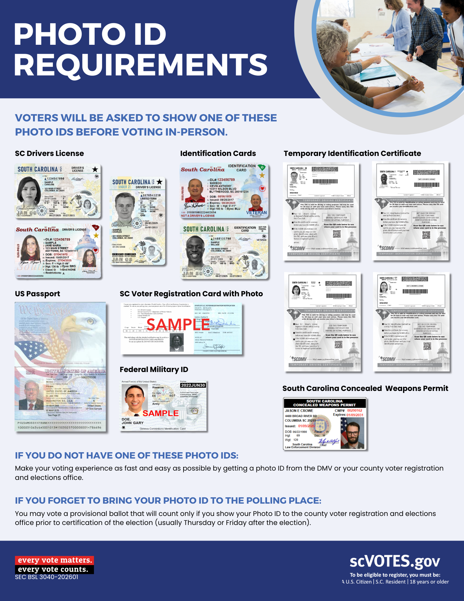 This poster outlines South Carolina's photo ID requirements for voting and what to do if you don't have an ID, including getting a free ID or voting a provisional ballot with a reasonable impediment.